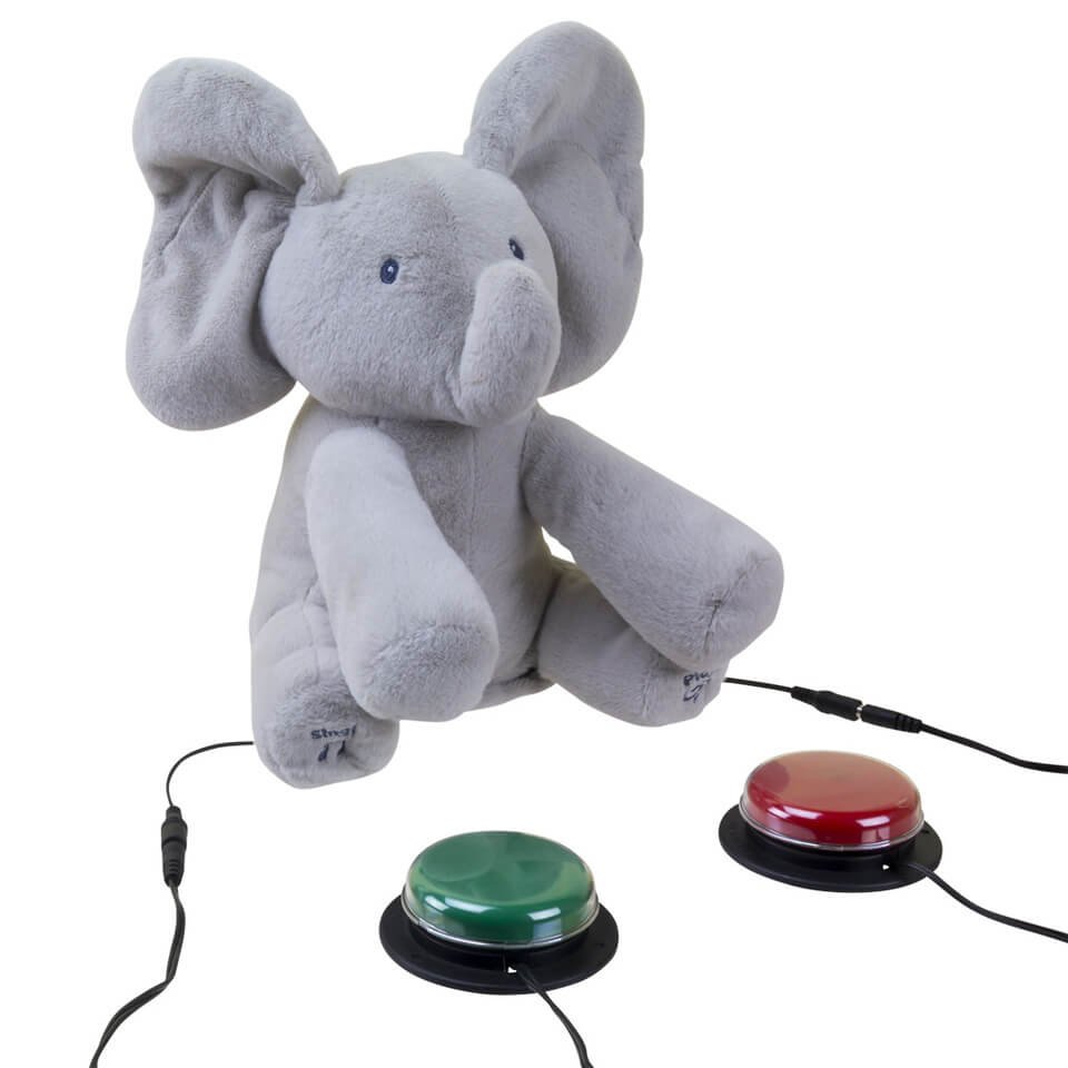 Flappy is an adorable singing animated plush elephant with two different play modes. Activate the switch attached to the left foot to play an interactive game of peek-a-boo, and the switch attached to the right foot to hear the song “Do Your Ears Hang Low” in a cute child’s voice. Activating the same switch a second time will stop the toy from playing.